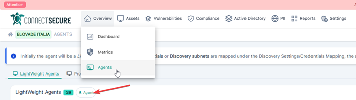 Per procedere con l’installazione di un agent, andare su Company View > Overview > Agent. Accanto alla voce Lightweight Agent, sarà possibile cliccare su Agent e scegliere l’architettura su cui si desidera installare l’agente.