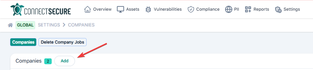 Accedere a https://portal.myconnctsecure.com, entrare nel menu Settings > Companies e cliccare sul pulsante ADD. Selezionare il tipo di company come Local, quindi inserire i dati relativi alla company. Se si desidera importare tramite un altro software, selezionare PSA Companies, dove verrà proposto quale sistema utilizzare e dove inserire i dati richiesti.