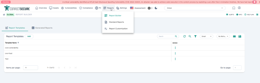Il Report Builder di ConnectSecure è uno strumento avanzato per la creazione di report personalizzati, disponibile esclusivamente dalla vista Global del portale.