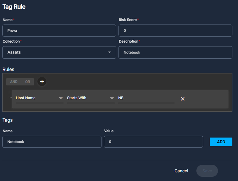 - Risk Score: se si inserisce un punteggio di rischio, questo andrà a modificare il rischio di qualsiasi asset a cui la regola corrisponde. Se non si desidera modificare il punteggio, inserire 0.