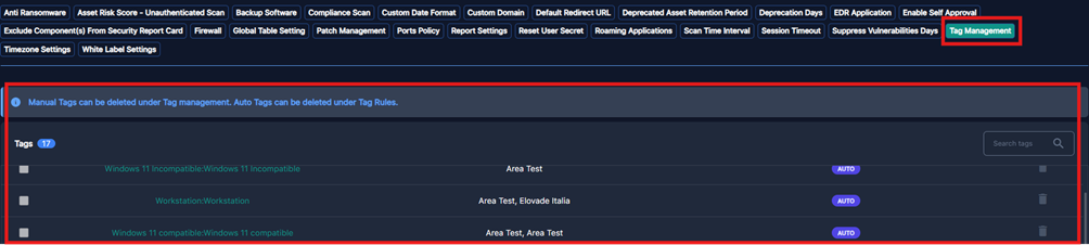 Percorso: Global > Settings> Global Settings > Tag management (solo dalla interfaccia Global).